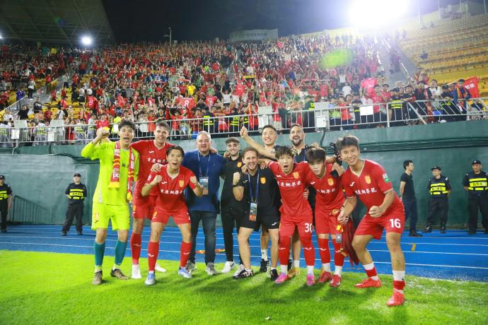 在今晚的比赛结束后,萨尔瓦多、教练组成员和徒弟们来到看台前,和心心念念的广州球迷们合影留念。